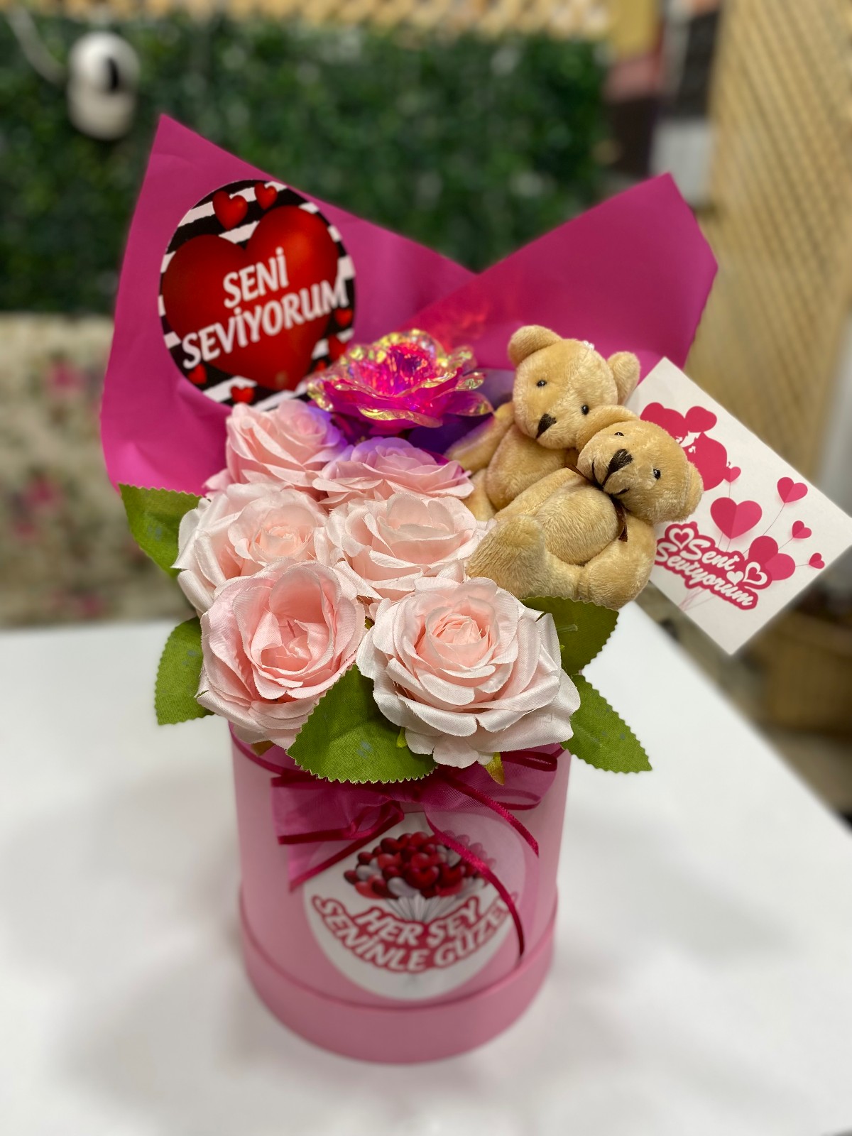 Kutuda Ayıcıklı Yapay Çiçek